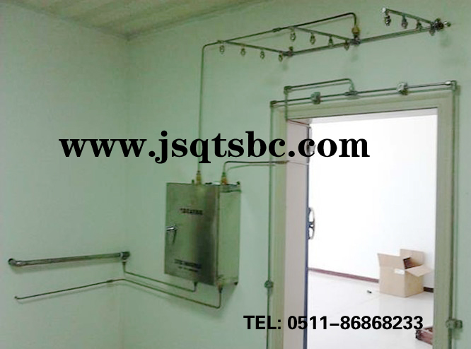 氣幕噴淋系統是煤礦井下避難硐室或救生艙的重要組成部分,是將壓縮空氣通過噴氣氣幕管形成氣幕,在避難硐室防護密閉門處形成一個相對隔絕的密閉室,過渡室上部的噴淋設備釋放大量的氣流,單向換氣閥將有毒氣體替換出去,不會隨著避險人員進入到生存室內。