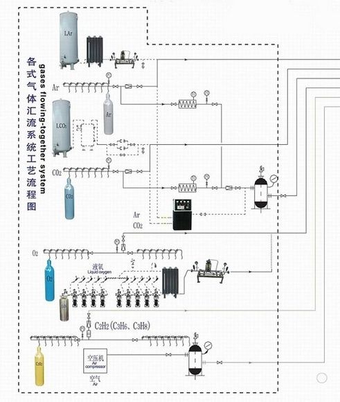 對于大型生產車間的工業用氣(氧氣、氬氣、二氧化碳、氫氣、乙炔、丙烷、液化石油氣等各種工業氣體),由于鋼結構車間用氣量比較大,采用我廠設計的工廠車間集中供氣系統裝置及方案,能為鋼結構車間修造船廠生產降低大量生產成本,拋棄瓶裝氣,使用方便而且成本低廉。